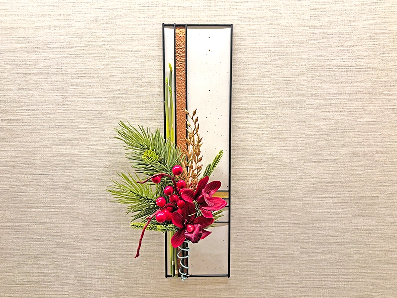 2025年冬の一輪挿しは、華やかな赤色のオーキッドや万両の実を組み合わせ、